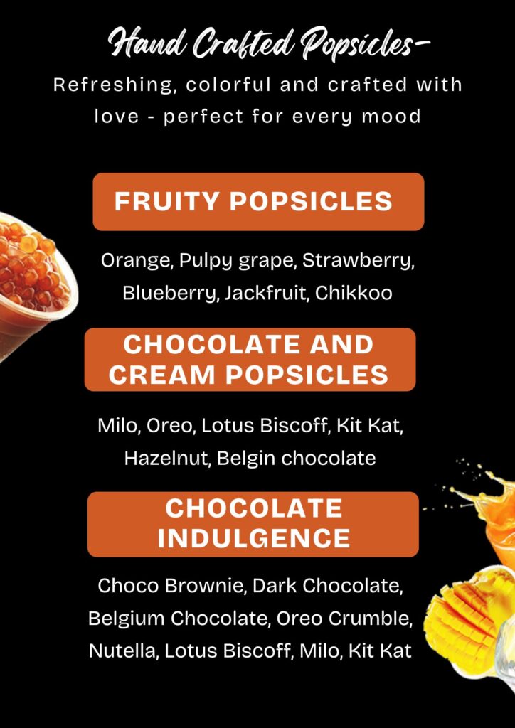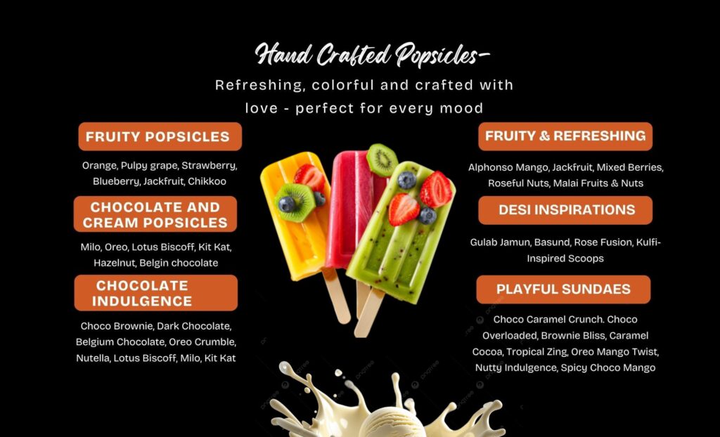 By 2024, the journey evolved as we introduced creamy scoops and playful sundaes, bringing even more colors, textures, and imagination to our menu. Unlike mass-produced brands, we stick to small-batch production, ensuring each popsicle, scoop, and sundae is crafted with love, premium ingredients, and innovation.